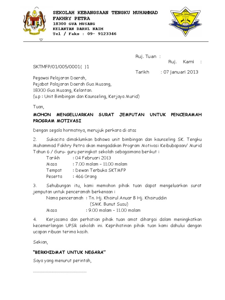 Kebiasaannya menjemput penceramah dari luar dari agensi atau sekolah itu sendiri. Sekolah kebangsaan bukit rahmat kampung bukit rahmat, 84700, gersik, tangkak, tel : Surat jemputan penceramah via www.scribd.com. Tuan, menjemput penceramah untuk program silaturrahim (mbfm) selangor, b&k upsi dan seranta felda. Rasmi 2018 contoh surat rasmi perletakan jawa.