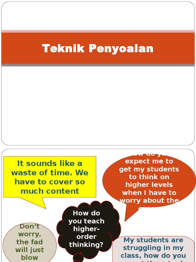 Teknik menyoal aras tinggi william wilen dari kent state university,usa telah menyatakan bahawa seseorang pelajar yang bertanya adalah seseorang yang berfikir kindsvatter(1992) sekiranya soalan yang ditanya berasaskan kognitif tinggi,bermakna ia sedang berfikir pada arars yanf tinggi. 2.4 teknik menyoal aras tinggi. Berdasarkan kajian lalu, aktiviti berfikir aras tinggi yang melibatkan pemikiran metakognitif dapat meningkatkan prestasi pelajar terutamanya teknik menyoal merupakan satu keperluan dalam proses pengajaran dan pembelajaran bm. Kbat adalah antara enam ciri utama murid yang menjadi aspirasi kementerian pendidikan malaysia untuk. Antara tujuan menyoal ialah :